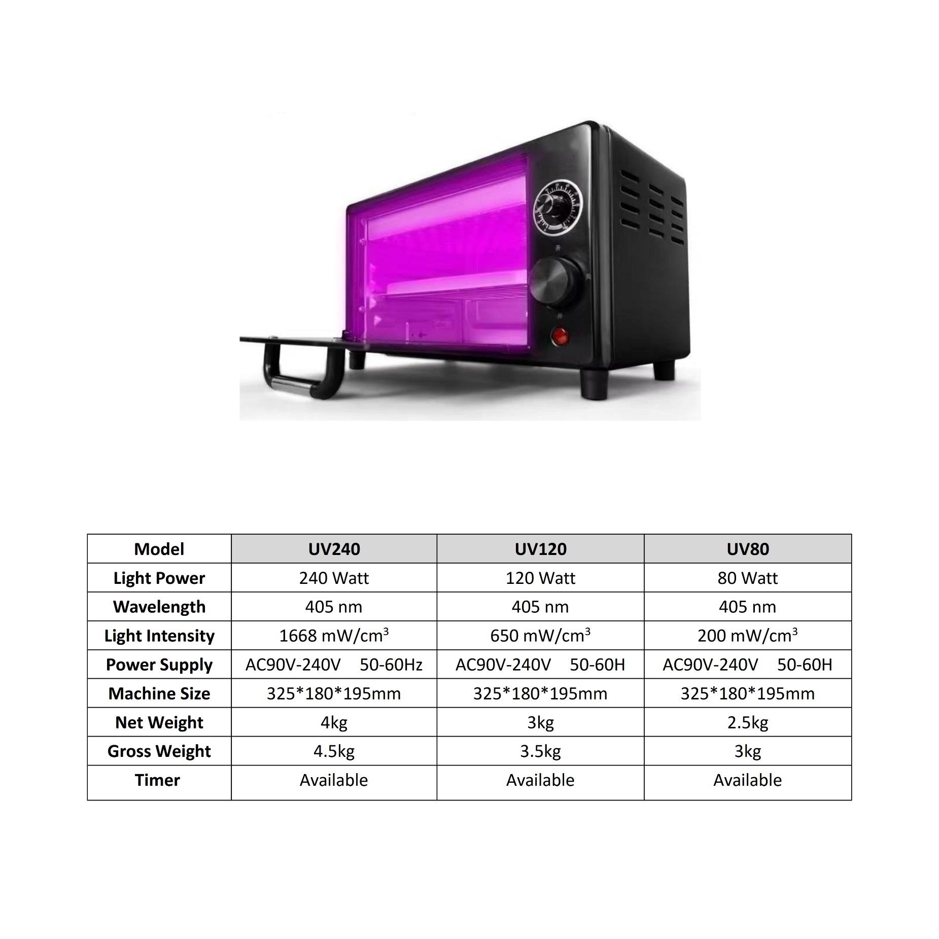 Keywords: UV Cure Machine; UV Cure Device; UV Post-curing Unit; Post-curing Chamber; Curebox; UV Cure Chamber; UV Cure Lamp; 405nm UV Cure Lamp; 385nm wavelength UV Cure Unit;